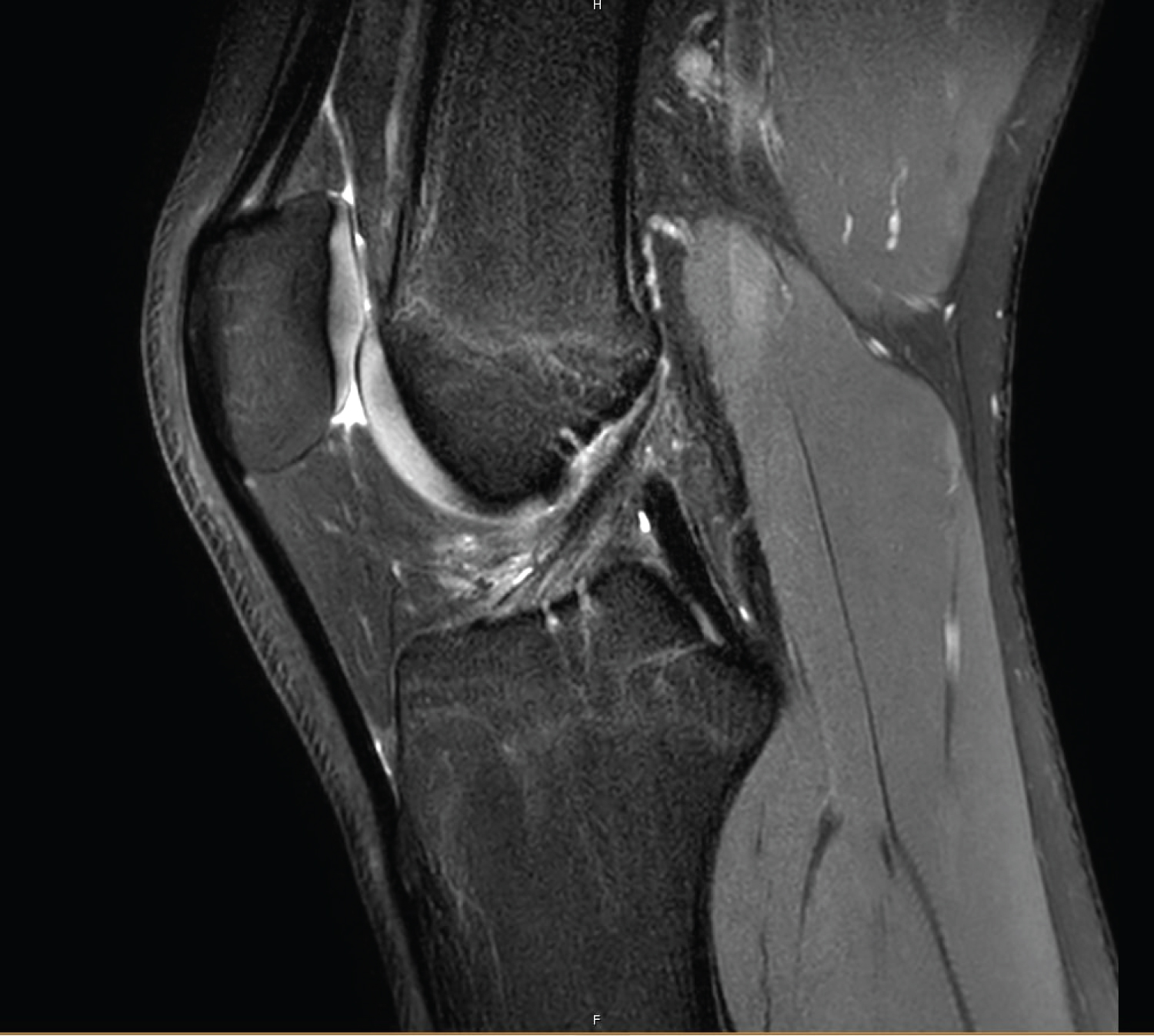Figure 5: Sagittal PD-weighted SPAIR image of low level hyperintensity change through the anterior cruciate ligament. View Figure 5