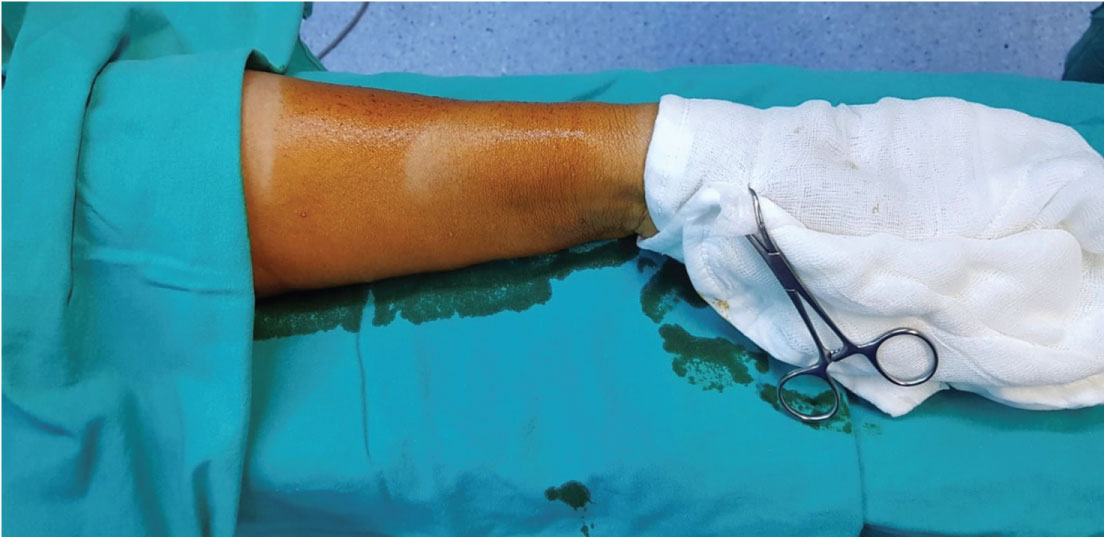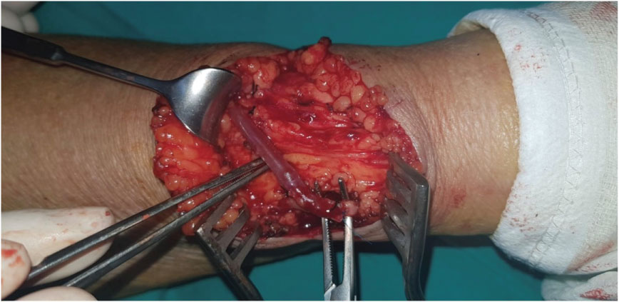 All operations were done under local anaesthesian the operating room. A standard Cimino-Brescia shunt was created at the wrist region of non-dominant arm (Figure 1). After induction of local anesthesia, S-shape 4 cm long incision at wrist and curvilinear shape 4-6 cm long incision at antecubital region were preferred. A proper vein with a diameter above 3 mm was choosen and prepared. Then, the fascia is opened and arter was found and prepared (Figure 2). All anastomosis were done with 6/0 or 7/0 polipropylene (prolene®, Ethicon, USA) and end to side technique was preferred (Figure 3). Venous distention, bruit on palpation of the anastomosis site and thrill sound were our criterias of a successful AVF creation and then the incision is closed with separated mattress sutures. In case of primary non-function or improper anatomy, AVF was created at antecubital fossa at the same session.