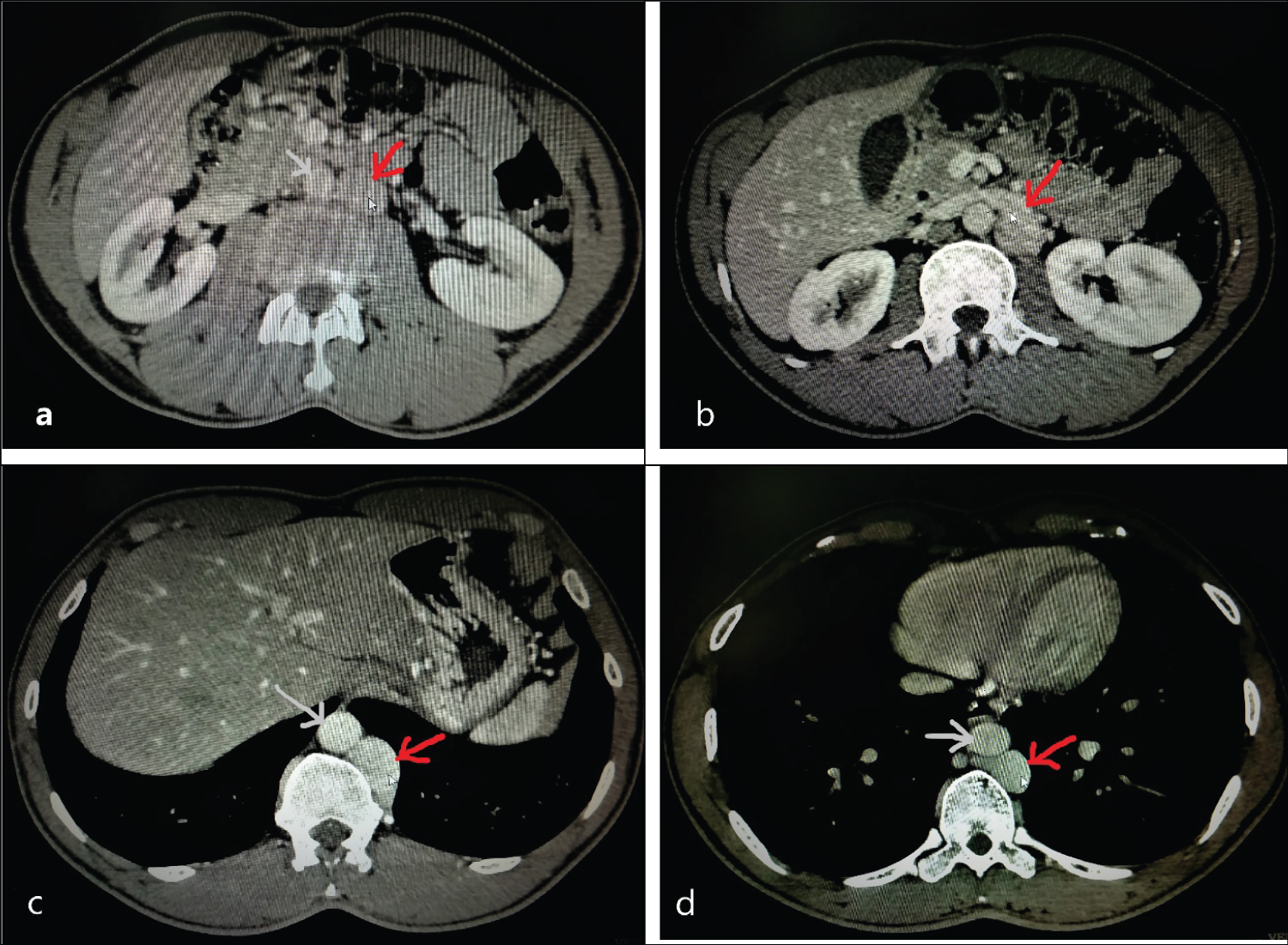 Figure 1: Left sided inferior vena cava. From caudal to cranial (a-d) show left sided inferior vena cava, origin of right renal vein from left inferior vena cava, continuation of left sided inferior vena cava till D10 vertebra further confirming complete left sided inferior vena cava(red arrow- inferior vena cava, grey arrow- aorta).