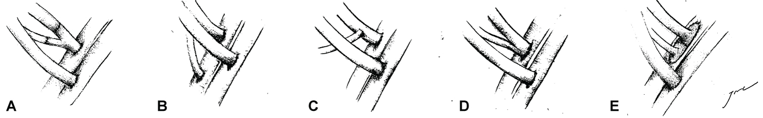 Figure 1: (A) End to side anastomosis to EIA utilising interposition Y-graft; (B) End to side anastamosis to EIA inferior to MRA anastamosis; (C) End to side anastamosis to MRA, with subsequent MRA-EIA anastomosis; (D) Side to side anastamosis to MRA, with subsequent end to side anastamosis to EIA; (E) End to side anastamosis to EIA utilising carrell patch.