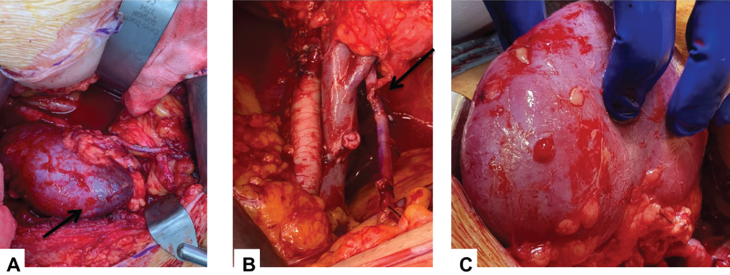 Figure 2: (A) Intra-operative appearance of dusky lower pole before accessory vessel anastamosis but after MRA reperfusion; (B) EIA anastamosis; (C) Post accessory vessel reperfusion and uniform appearance of cortex.