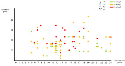 Figure 1: Invasive breast carcinomas. Tumor size (mm), tumor histology (IDC, ILC, TC, MC), and grading (1,2,3) depending on the time interval between the MRI examinations (in months).