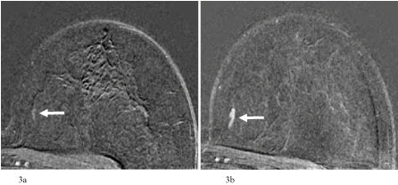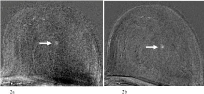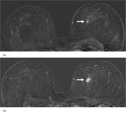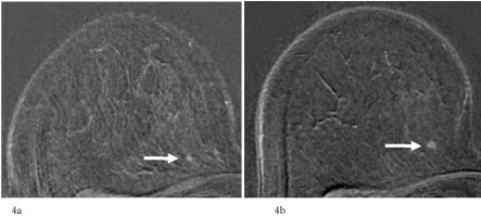 MRI depicted invasive breast carcinomas at an average size of 9 mm when performed in intervals of 24 months or less. This size correlates very well with the commonly accepted data concerning the rate of growth of invasive breast cancer, assuming a tumor-duplication-time of 200-400 days depending on the aggressiveness of the lesion. An invasive breast cancer of 2 mm, for example, is sustained by diffusion, and will not usually be detected on MRI due to the lack of angiogenesis. One year later the estimated size of this lesion is approximately 4 mm, and tumor angiogenesis will have occured. At this time, MRI is often able to depict this tumor due to its increased enhancement. Another year later, at a tumor size of approximately 8 mm, MRI should normally detect this tumor reliably. The dynamics of tumor growth is demonstrated in the following exemplary cases from the study (Figure 2a, Figure 2b, Figure 3a, Figure 3b, Figure 4a and Figure 4b).