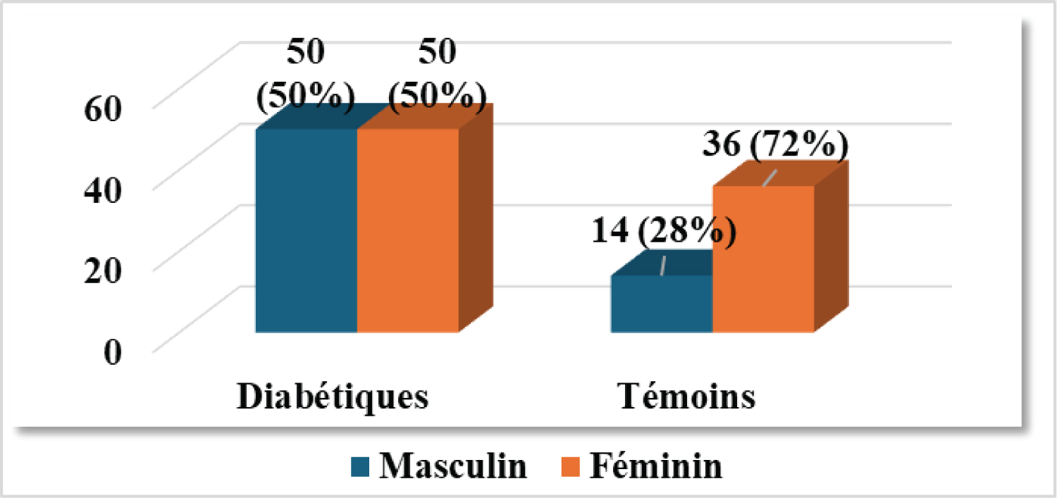 The gender distribution (Figure 2) for T2DM patients was 50/100 females, with a sex ratio of 1. In the controls, there was a clear predominance of females (36/50). There was a statistically significant difference between controls and controls with p = 0.01.