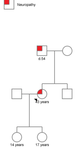 A 43-year-old female with a family history of neuropathy presented with bilateral progressive proximal muscle weakness with sensory involvement. She first noticed reduced sensation and muscle weakness 3 years back and was clinically diagnosed to have hereditary sensory motor neuropathy. Her MRI scan (Brain and whole Spinal) was normal nerve conduction studies (NCS) and Electromyography (EMG) report was suggestive of motor & sensory demyelinating polyneuropathy with features of focal segmental involvement. Her creatinine phosphokinase (CPK) levels were elevated. However, all other investigations were within normal range. Probands father who had died at the age of 54 yrs. due to an unknown cause had symptoms of sensory motor neuropathy, which manifested at the age of 24 years. Probands two daughters age 14 and 17 years are asymptomatic and was found to be free of the mutation (Figure 1). Whole exome sequencing of the proband revealed a previously unreported heterozygous missense Variant in the MFN2 gene which is likely pathogenic.