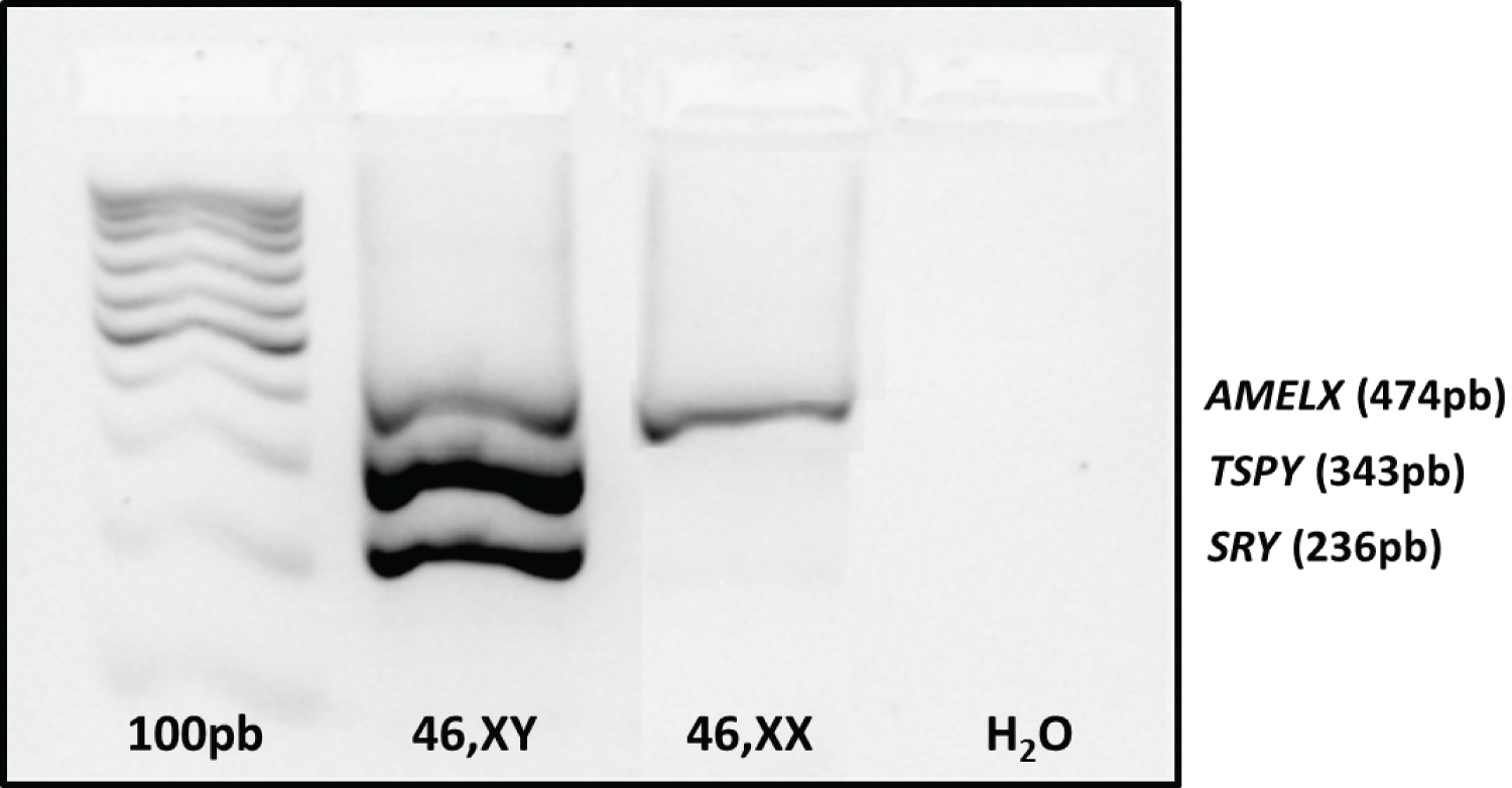 The main difficulty found for the standardization of mPCR was in adjusting the amplifications, which had bands with low intensity for the SRY and AMELX genes in the agarose gel. The increase in magnesium concentrations of these primers and subsequent change in the type of DNA polymerase from conventional to hotstart, allowed solving this problem. We would have liked to have developed an mPCR with a larger number of fragments of the Y chromosome, but it was not possible due to the great competition between the primers.