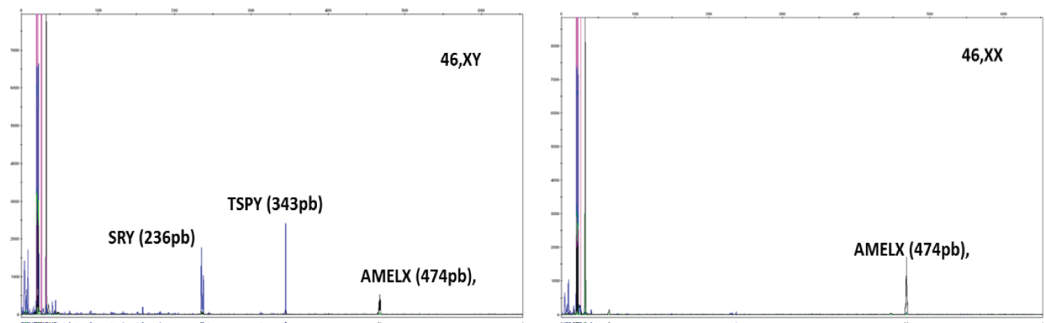 Genes SRY (236bp) and TSPY (343bp) present on the Y chromosome and AMELX gene (474bp) present on the X chromosome (internal reaction control). Channels 1: ladder 100bp, 2: control 46, XY; 3: control 46, XX and 4: white.