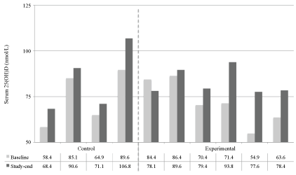 Figure 1: Serum levels of 25(OH)D for all participants at baseline and study-end. Note: Baseline and study-end values are in nmol/L. The dashed vertical line between columns 4 and 5 seperates results for the control and the experimental group. Serum levels of 25(OH)D < 50 nmol/L represents deficiency status. Serum levels of 25 (OH ) D > between 50 and 75 nmol/L represent insufficiency status. Serum levels > 75 nmol/L represents sufficiency status. All participants of 25(OH)D > 50 nmol/L (above defiency status) at baseline and study-end. View Figure 1