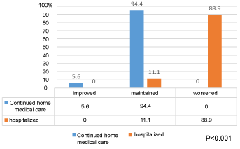 Figure 1: Comparison of changes in degree of independent living for elderly with disability before and after treatment between continued home care group and hospitalized group (Fisher exact test; P < 0.001). View Figure 1