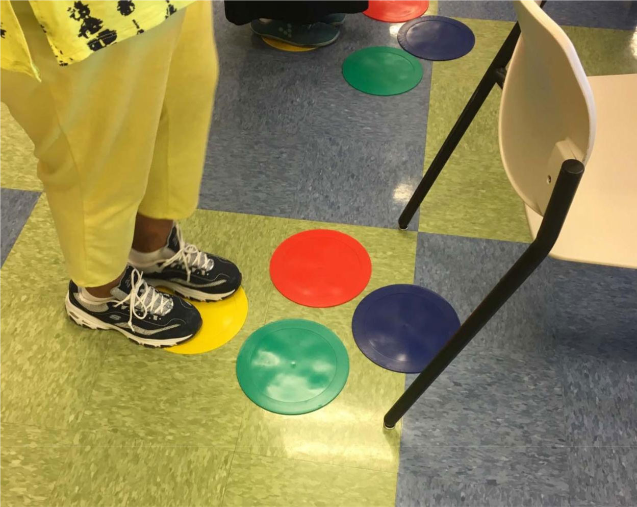 In addition to MOB described above, participants that were randomly assigned to MOB plus DTBC received a 15-min DTBC intervention each class, i.e., ankle-reaching balance tasks using either their right to left foot to tap differently colored 9-inch round vinyl markers. Three colored markers (e.g., green, blue, red) were placed on the ground in an arc, with the fourth maker (e.g., yellow) placed a neutral position behind the arc (Figure 1). A chair can be placed in front of the color pattern, as needed for safety. To enhance balance, participants stand with both feet in the neutral position 12 inches behind the pattern, and then perform an ankle-reaching balance task to the colors in the pattern by tapping a foot to the color and then tapping back to neutral (center position); first using a fixed order (green, blue, red) beginning left-to-right each time; then done in reverse order. Cognitively challenging ordering of tasks were then added by calling out randomly selected colors to increase difficulty. This was performed for 15 minutes during each class period. El Rio provided two experienced and certified MOB instructors, with additional training in providing the DTBC intervention, for this study.