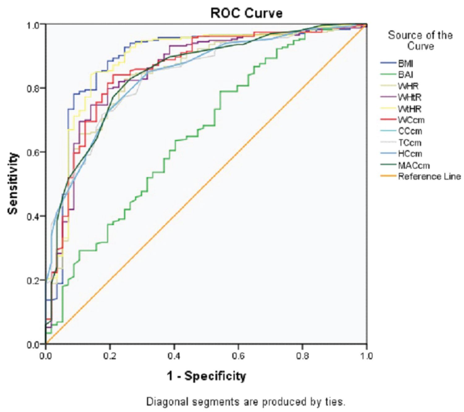 Contrary to other findings [7,27,28], this study revealed no significant gender differences in the cutoff point for most of the anthropometric indices with varrying sensitivity and specificity except for WC (male = 75.82 cm, female = 63.41 cm), WHR (male = 0.84, female = 0.74), WHtR (male = 45.93, female = 41.99) and BAI (male = 24.54, female = 29.04).