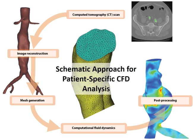 Figure 3: Patient-specific workflow combining computed tomography (CT) data, image reconstruction of the 3D aortic structure and computational fluid dynamics (CFD) for predicting hemodynamic properties.