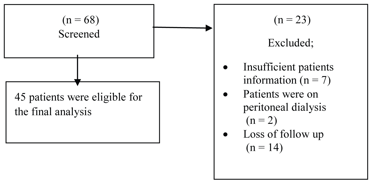 From a total 68 patients' charts were screened, 23 were excluded due to insufficient patients information (n = 7), patients were on peritoneal dialysis (n = 2), and 14 patients were excluded due to loss of follow up. The remaining 45 patients were eligible for the final analysis (Figure 1).