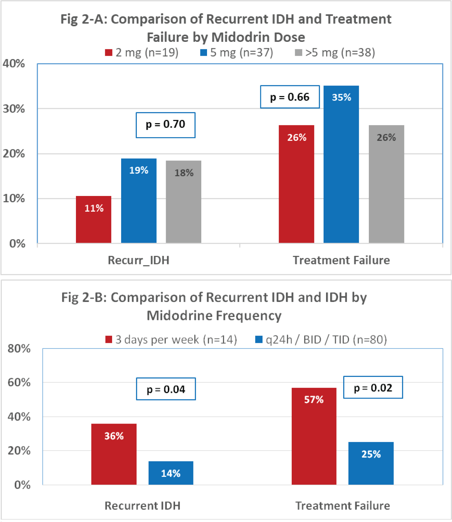 Figure 2: (A) Comparison of recurrent IDH and treatement failure by midodrine dose; (2B) Comparison of recurrent IDH and IDH by midodrine frequency.