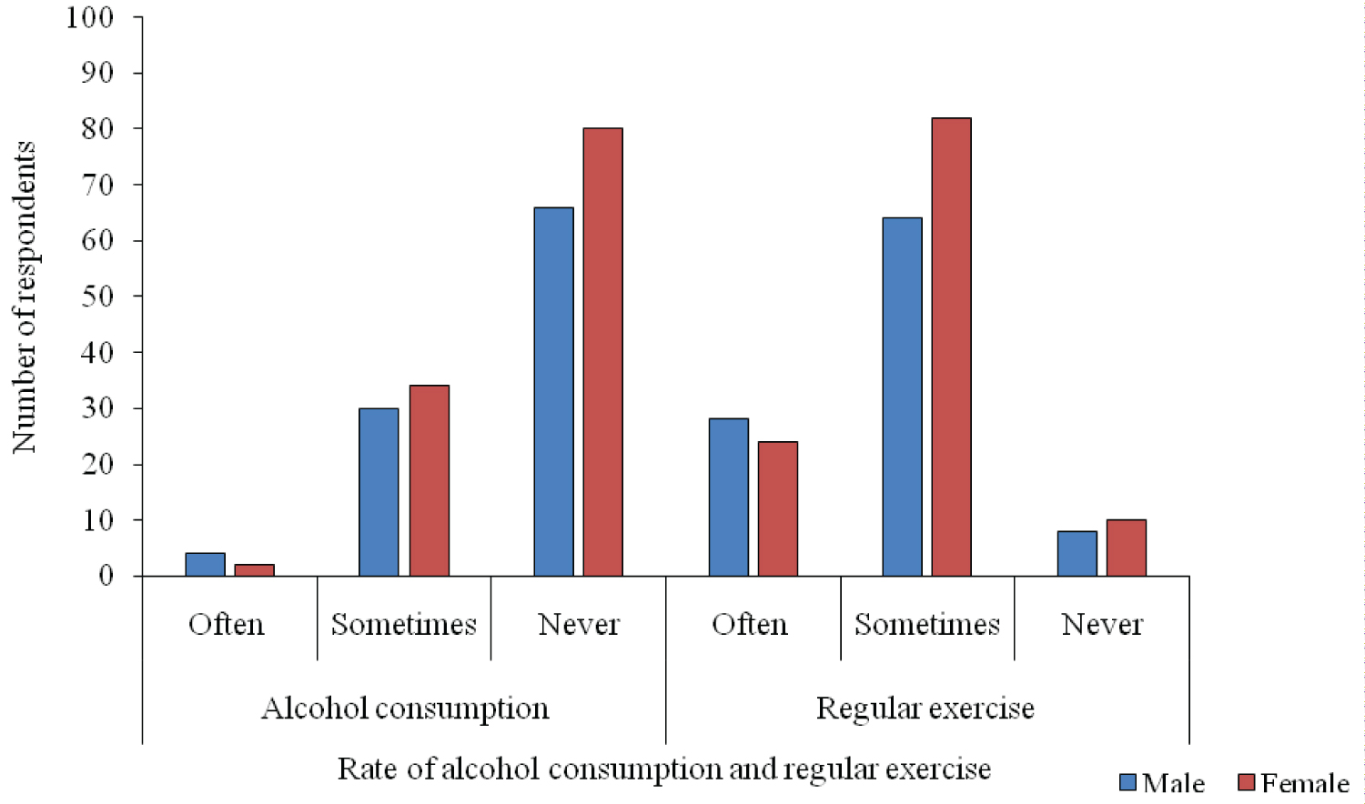 About 6 (2.8%) comprising 4 (1.9%) and 2 (0.9%) of the respondents consume alcohol regularly, while 52 (24.1%) made up of 28 (13%) males and 24 (11.1%) females of the respondents engage in regular exercise (Figure 1).