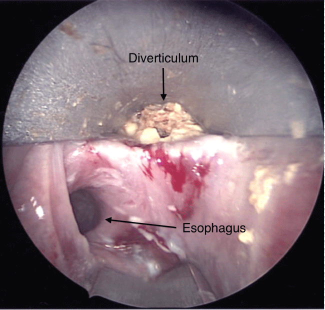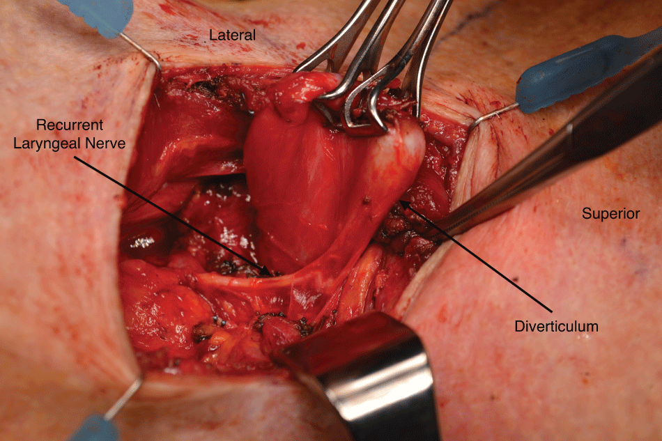 A 78-year-old male presented to an outpatient clinic with a history of persistent dysphagia, globus sensation, cough during deglutition, gastro-esophageal reflux disease (GERD) and occasional regurgitation. His physical exam, including fiberoptic laryngoscopy, was normal but a barium esophogram and subsequent Computed Tomography (CT) scan demonstrated a right-sided esophageal diverticulum inferior to the cricopharyngeus and anterolateral to the esophagus, consistent with a Killian-Jamieson Diverticulum (KJD) (Figure 1). The patient was then taken to the operating room for definitive open diverticulectomy given the concern for the potential intimate relationship between the recurrent laryngeal nerve (RLN) and the diverticulum. Following induction of general anesthesia with insertion of a NIM endotracheal tube (Medtronic), a Weerda diverticuloscope was introduced to visualize the diverticulum, which was found to be distal to the cricopharyngeus muscle and projecting anterolaterally to the patient's right, thus confirming the diagnosis of KJD. A cervical rigid esophagoscopy was performed. The pouch was fully impacted with food debris (Figure 2). Following disimpaction and irrigation, an orogastric tube was used to cannulate the esophagus and strip gauze was packed into the pouch to aid in identification of the sack once the neck was opened. A right-sided horizontal neck incision was used to expose the diverticulum, which measured 3.5 cm in length. The RLN was found to be adherent to the medial neck of the diverticulum (Figure 3), and was carefully dissected away prior to excision of the pouch with an Endo GIA articulating stapler. A myotomy of the circular muscle fibers immediately inferior to the diverticulum was also performed. The incision was closed in layers and a small penrose drain was left in situ and removed on postoperative day 1. A follow up gastrograffin swallow study on post-operative day 5 demonstrated an intact staple line and the patient was started on a liquid diet. He was advanced to a soft diet and discharged on postoperative day 6.