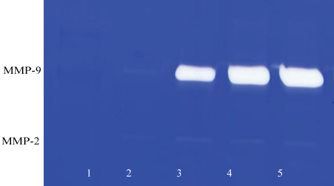 Figure 1C: Gelatinase zymogram of FaDu cells treated with PMA shows a dose-dependent increase in MMP-9. Legend: 1-Markers, 2-Control/no treatment, 3-5: 25, 50, 100 ng/ml PMA.
