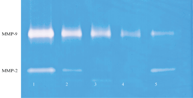 Figure 2C: Gelatinase zymogram of tongue carcinoma cells treated with EGCG shows a dose-dependent decrease in both MMP-2 and MMP-9. Legend: 1-Control/no treatment, 2-5: 25, 50, 75, 100 μM EGCG with 100 ng/ml PMA.