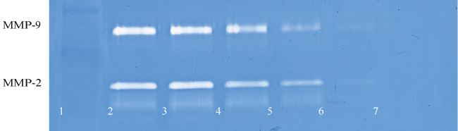 Figure 3A: Gelatinase zymogram of laryngeal squamous cell carcinoma cells treated with a nutrient mixture. Legend: 1- Marker, 2- Control/no treatment, 3-7: 10, 50, 100, 500, 1000 μg/ml Nutrient Mixture.