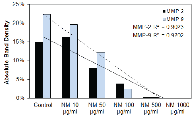 Figure 3D: Results of densitometric analysis of the SCC-25 gelatinase zymogram showing a dose-dependent decrease in the secretion of both MMP-2 and MMP-9 after treatment with nutrient mixture.