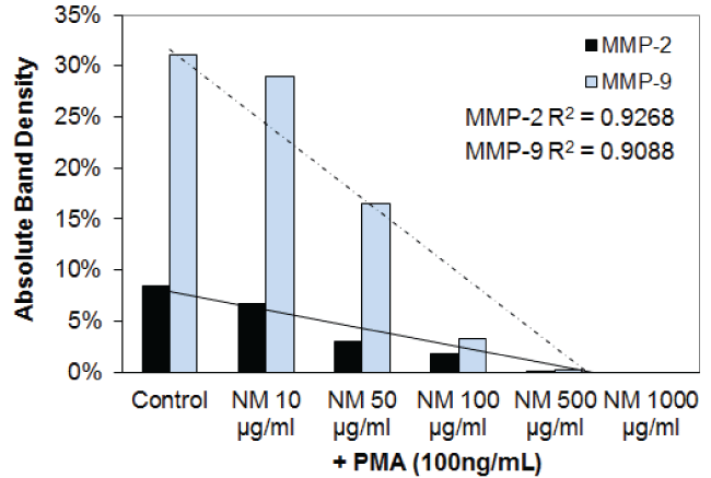 Figure 3H: Results of densitometry analysis of the SCC-25 gelatinase zymogram after nutrient mixture treatment in the presence of PMA showing a dose-dependent decrease in both MMP-2 and MMP-9.