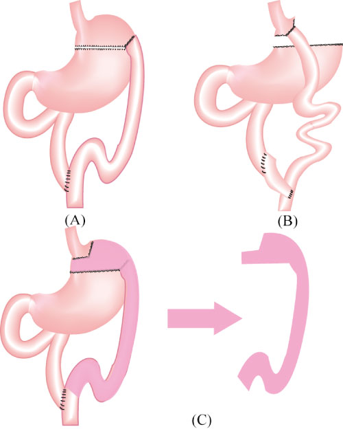 Figure 1: Two types of roux-en-Y gastric bypass surgery. A) Modified roux-en-Y gastric bypass surgery, which has a gastric pouch between 30-400 mL, and shorter alimentary and bilio-pancreatic limbs below 80 cm, is performed for diabetes patients with BMI < 35 kg/m2 by Chinese clinicians in order to balance the risk of malnutrition; B) Roux-en-Y gastric bypass surgery with a gastric pouch 15-30 mL and alimentary and bilio-pancreatic limbs 75-150 cm according to the weight of patient is suitable for obese type 2 diabetes mellitus treatment. The gastric pouch is anastomosed to the distal portion of the jejunum (Roux limb), and the distal stomach and proximal portions of the jejunum (biliopancreatic limb) are anastomosed farther down the jejunum to create a common channel. At present, there is no unified standard for the length of alimentary and bilio-pancreatic limbs; C) Closed proximal jejunum using a linear cutting staple by an end-to-side anastomosis and the gastric fundus and proximal jejunum are removed. View Figure 1