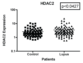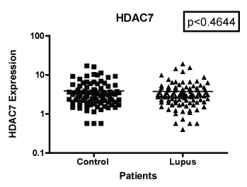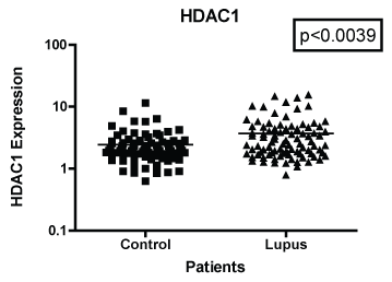 The difficulties in designing an effective pharmacological therapy for Systemic Lupus Erythematosus (SLE) are due in part to the complexities of its pathophysiology. However, recently researchers have begun to look at the role chromatin modification plays in SLE. Chromatin modification is important in the regulation of genomic expression. One of the essential parts of chromatin structure are the histones. Histones are responsible for binding the nucleosome and provide the entry and exit sites to DNA. Like DNA, histones can also be subjected to epigenetic events. A group of enzymes that have shown to play a key role in histone modification are histone deacetylases (HDACs). HDAC enzymes work on the amino terminal tail of histones. They are able to regulate gene expression by modulating histone acetylation patterns [1]. There are 18 genes identified as HDACs. These 18 genes can further be grouped into four classes based on their structural functional capabilities. There has been increasing evidence that targeting certain classes of HDACs can provide therapeutic benefit to patients with SLE. For example, preclinical studies have shown that using the HDAC inhibitor (HDACi), Trichostatin A (TSA), can reduce anti-DNA autoantibody production [2]. In addition, suberorylanide hydroxamic acid (SAHA), a HDAC inhibitor, in combination with TSA can reduce IL-6, IL-12, IFN-γ, and IL-10 production leading to a decrease in inflammation response as well as decreases in proteinuria and glomerulonephritis in murine models [3,4]. Due to the effects of HDACi in their ability to reduce inflammation in murine models, researchers have postulated their use for patients to control inflammation such as those that occur with SLE [5-8]. However, studies regarding HDAC expression levels in patients with SLE are lacking. Here we compare expression levels of HDAC 1, HDAC 2 and HDAC 7 among patients with SLE to their age, sex, and ethnicity matched controls.