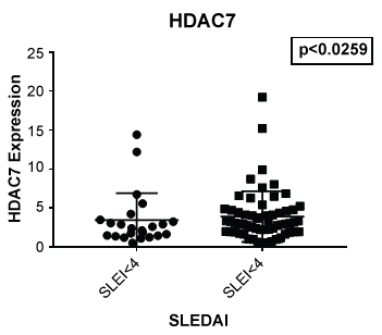 Figure 6: Although no significant difference was noted between lupus and non-lupus in expression of HDAC 7, lupus patients with a SLEDAI of 4 or greater showed an increased expression of HDAC7 (p < 0.0259) when compared to those with a SLEDAI of less than 4.