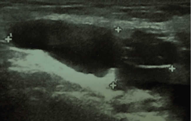 If swelling in the inguinal region and labium majus is recognized in the adult female, fine-needle aspiration can be helpful to assist in making an accurate diagnosis. Normally this peritoneal evagination undergoes obliteration soon after birth in both sexes. Clinically a cyst of the canal of Nuck appears as a fluctuant irreducible mass causing mild pain or a painless lump in the inguinal region. In one third of patients an associated inguinal hernia is present, so diagnosis can be difficult [9]. A cyst of the canal of Nuck is different from an inguinal hernia sac as there is no omental and intestinal contents within the cystic mass. The differential diagnosis list includes also enlarged lymph nodes and soft tissue tumors (e.g. lipomas, leiomyomas and endometriosis of the round ligament). Sonography is an easily applied and highly accurate imaging modality. A tubular or oval anechoic lesion in the inguinal area or labium majus is observed. Differential diagnosis with abcess or solid mass is mainly suggested by manual evaluation, patient's conditions and high temperature.