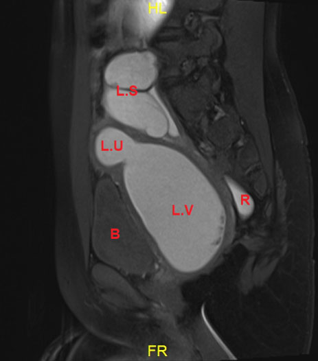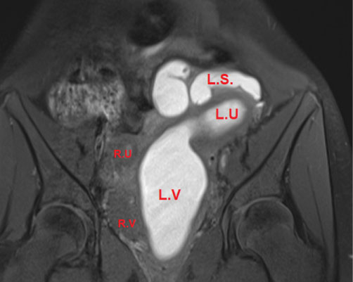LU: Left uterus horne, Dilated (metrocolpos) >; LV: Left vagina, Dilated (Hematocolpos); LS: Left salpinx (hematosalpinx); RU: Right uterus horne; RV: Right vagina.