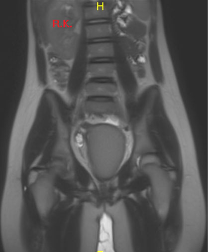Pelvic MRI showed uterus Didelphis with two hemi-uteri and two hemi-vaginas, the left hemi-vagina was blind, (Figure 1), left hematometro-colpos, and hematosalpinx overlying the dome of the urinary bladder (Figure 2 and Figure 3), Also, it showed left renal agenesis (Figure 4).