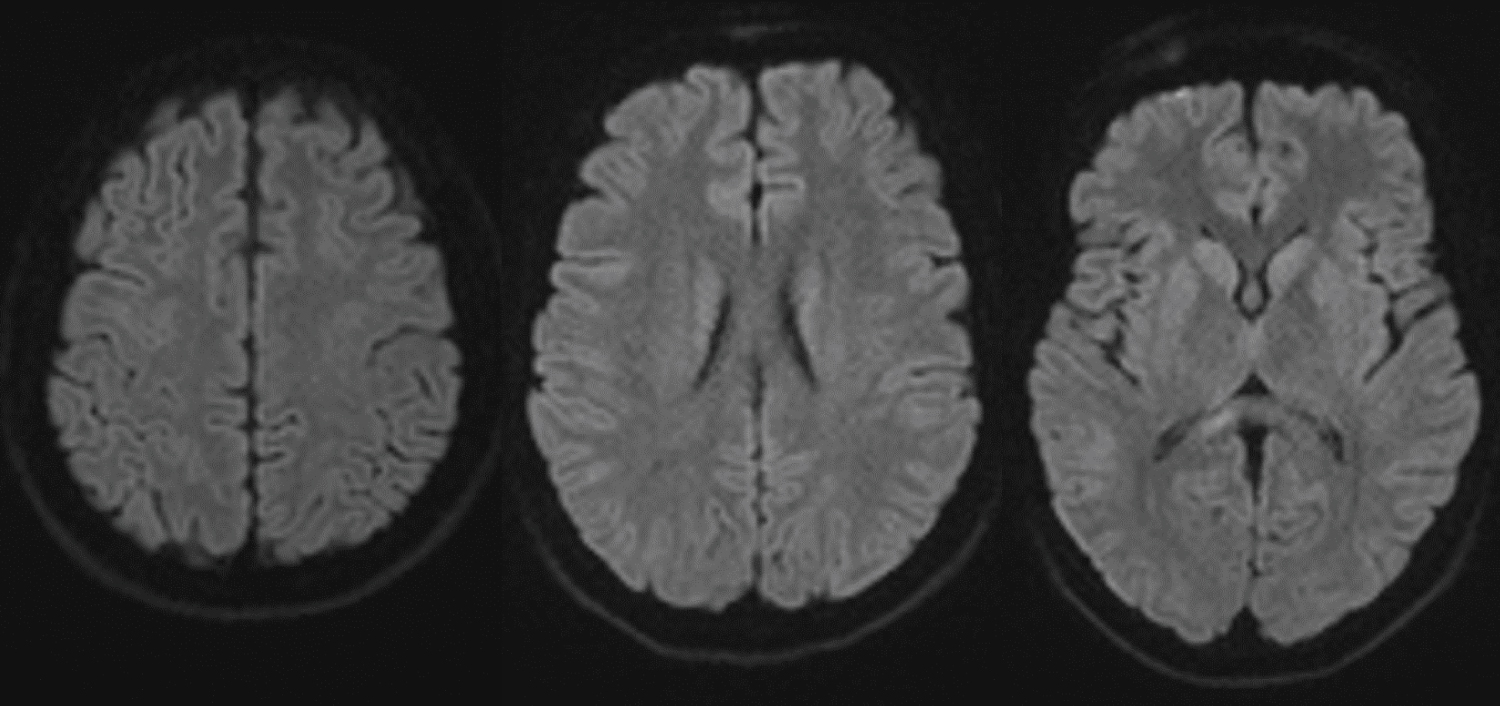 Figure 3: MRI FLAIR imaging after 10 days: Improvement of hyperintensity of known cerebral lesions.