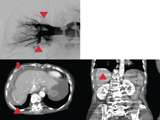 Figure 1: (Left upper) Arrowheads show obstruction of the upper and lower branches of the pulmonary artery in right pulmonary angiography; (Left lower) Arrow demonstrates fluid collection in the abdominal cavity in CE-CT. Arrowhead shows extravasation at the posterior segment in CE-CT at axial figure; (Right lower) Arrowhead shows extravasation at the posterior segment in CE-CT at coronal figure.
