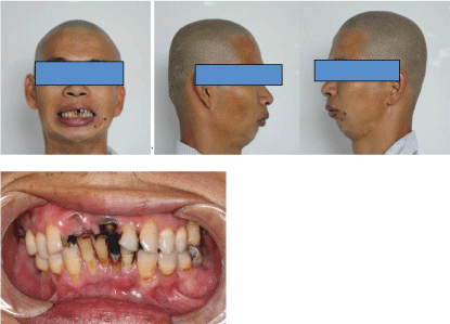 Figure 1: The patient have no movement of his mandibular, completely restriction in opening mouth, bird face, malocclusion, bad oral hygiene.