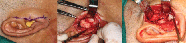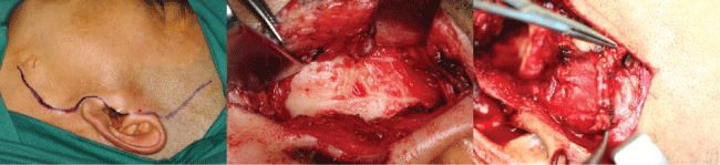 Figure 3: The left side preauricular incision to show the bony ankylotic mass, recontruction the condylar and interpositional tissue with the temporalis superficial fascial flap.