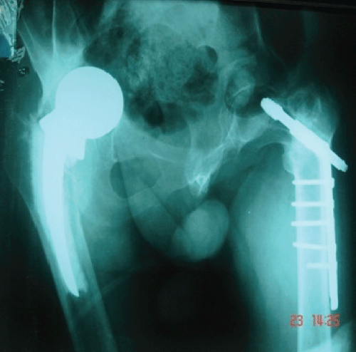 Figure 5: Plain X-ray demonstrates failure of dynamic hip screw for left NoF and hemi-arthroplasty for right side.