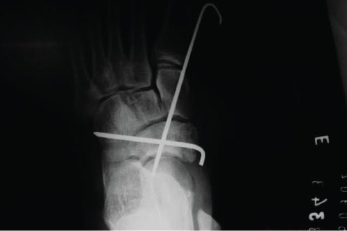 Figure 2: Fixation with two crossed K-wires. One between the medial cuneiform, navicular and talus, and another between the navicular and cuboid.