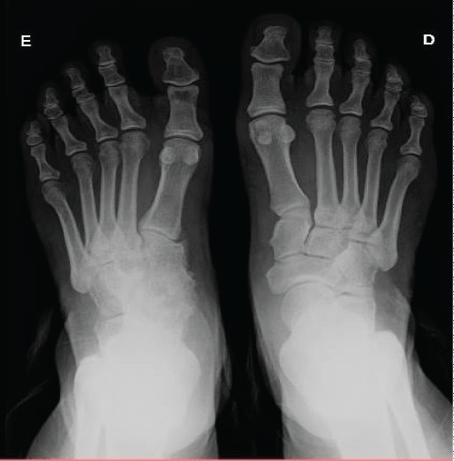 Figure 6: Antero-posterior plain X-ray 13 years after ORIF showing the consolidation in her left foot.
