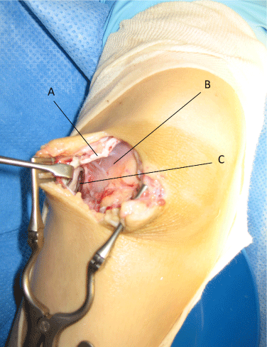Figure 3: Per-operative photograph showing the potential space between capsule and synovium of the right knee. A - capsule; B - Synovium; C - Space between capsule and synovium. View Figure 3